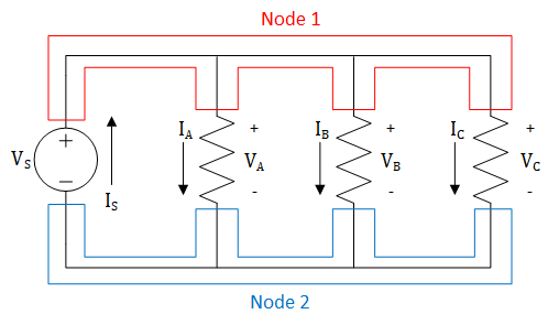 Figure 5: Nodes in a parallel circuit with one voltage source and three resistors