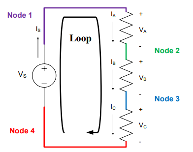 Figure 8: Nodes and loops for a series circuit[3] with one voltage source and three resistors