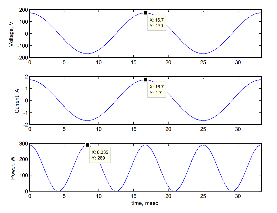 Let’s use the values from the example above to explain this concept. Looking at the voltage and current at t = 0 s, we have v(0) = 170 V while i(0) = 1.70 A. At this instant in time, the power output from the source is: