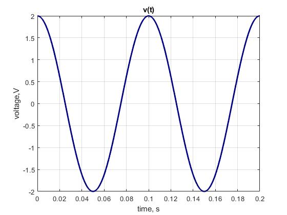 b) \(v(t) = 2\ cos(360{^\circ}*10\ Hz*t)\ V\)