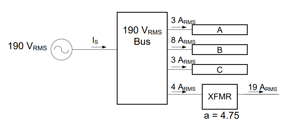 We can solve for the current coming from the source to the 190 VRMS Bus. It is very important to realize only 4 ARMS leaves the bus to go to the transformer.