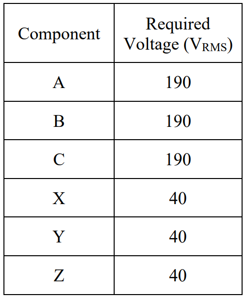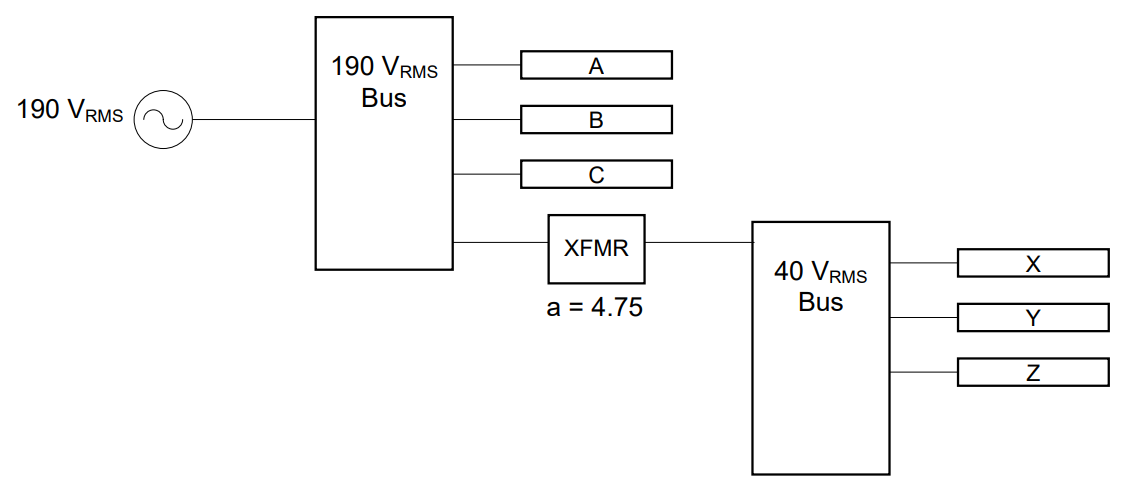 The devices A, B, C, X, Y, and Z are added merely to show how various devices are connected to each bus. The 190 VRMS bus receives power from the generator and distributes this power to devices A, B, and C, and also to a transformer. The transformer steps the voltage down to 40 VRMS and sends the dropped-down voltage to the 40 VRMS bus, which in turn provides power to devices X, Y, and Z.