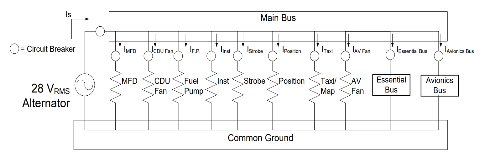 Since all of the devices (including the Essential and Avionics Busses) require the same voltage, we put everything in parallel with the voltage source (the 28 VRMS alternator). Hopefully, this makes sense, since devices in parallel share the same voltage and we want everything to share 28 VRMS. If we added anything else to the bus, it would also be added in parallel and would therefore get the full 28 VRMS dropped across it. But where is the Main Bus in this circuit diagram? The bus is simply the upper node of the circuit, as in Figure 3: