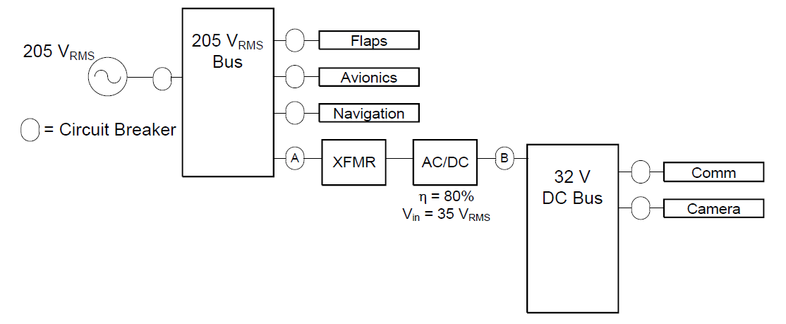 \[P_{\text{flaps,in}} = \frac{11{,}190\,\text{W}}{0.62} = 18\,\text{kW} \implies I_{\text{Flaps}} = \frac{18{,}000}{205} = 88\,\text{A}\]