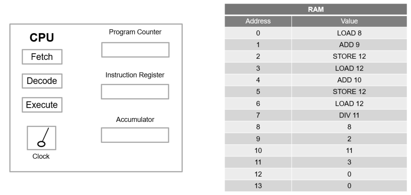 The program shown below calculates the average of three numbers. After eight CPU cycles have executed, determine the values of the Instruction Register (IR), the accumulator, and RAM address 12.