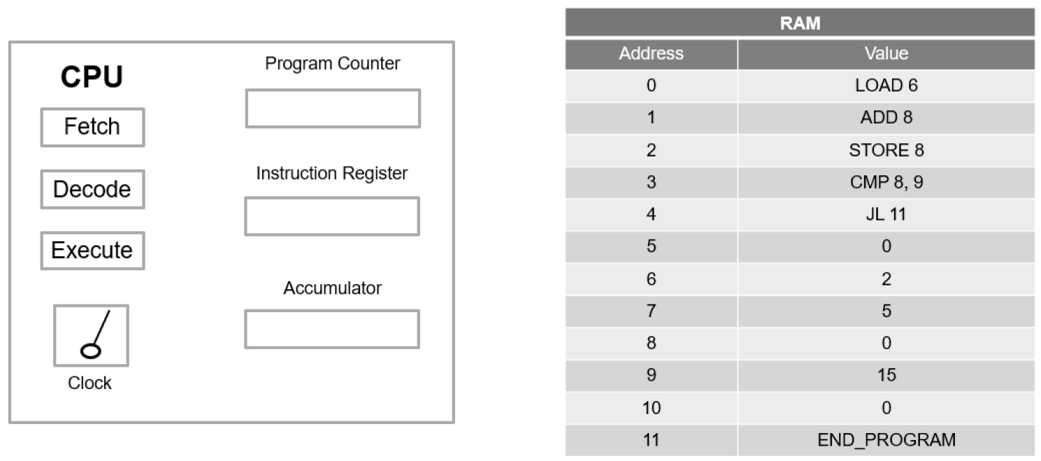 The assembly program shown below compares two numbers. After five CPU cycles have executed, determine the values of the Program Counter (PC), Instruction Register (IR), accumulator, and RAM address 8.