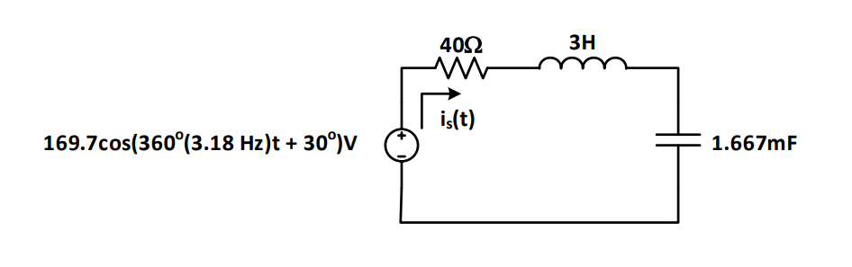 Find the expression for the steady state sinusoidal current, is(t), that flows in the following circuit:
