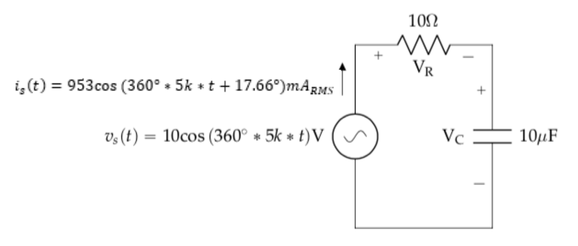 Solve: First, we will use Ohm’s Law to find the voltage VC. Since the current is given in the time domain, we need to convert Is to phasor form. Remember, the magnitude of the phasor term needs to be RMS, so we have: