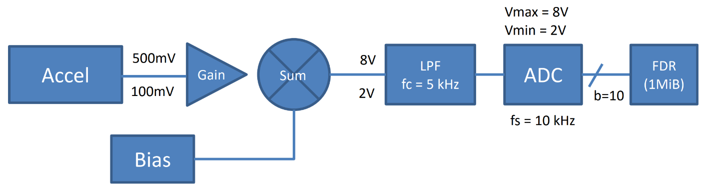 An accelerometer signal is amplified with a gain of \(1000\), filtered to prevent aliasing, and then digitized using the system below.