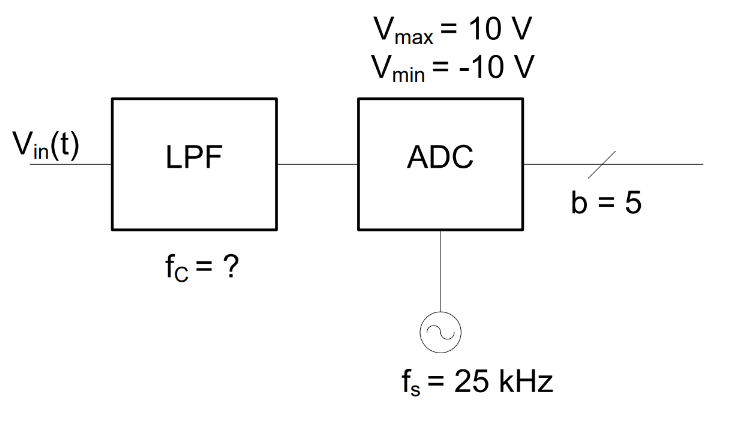 The filtered signal is then applied to the ADC, which samples at frequency \(f_s\). To prevent aliasing, the cutoff frequency of the LPF must satisfy: