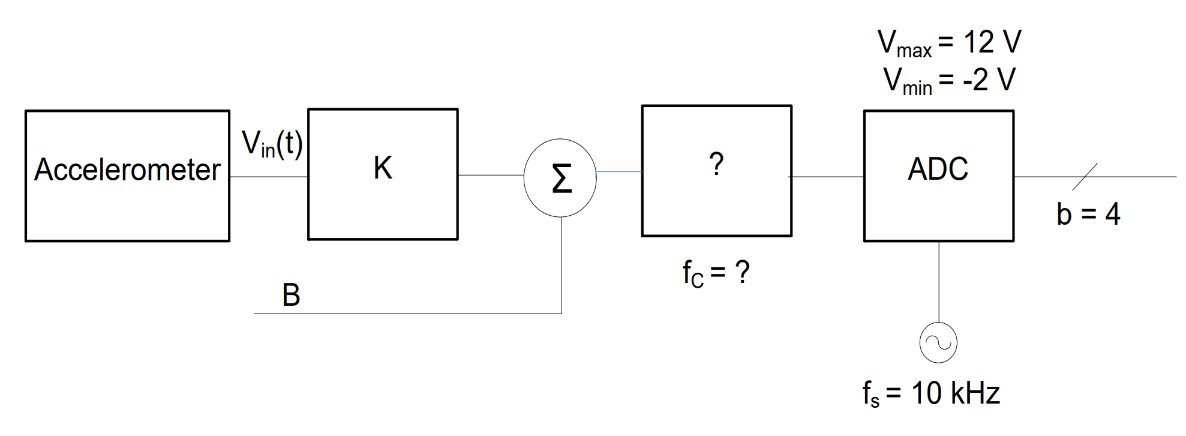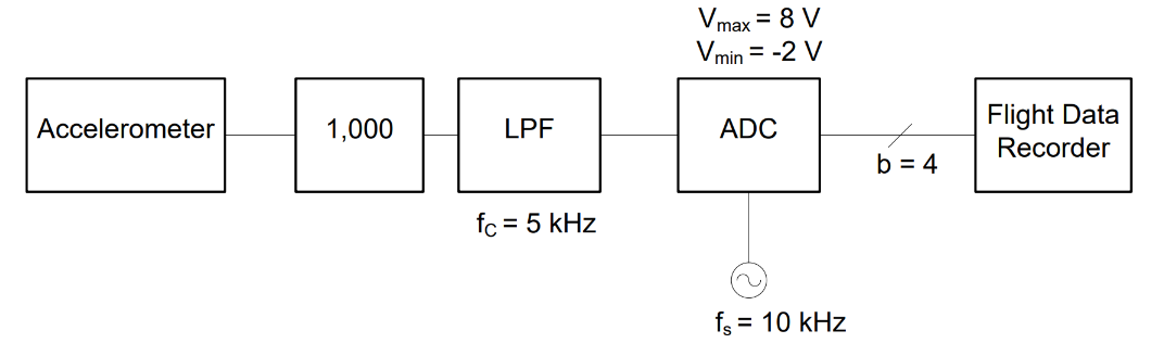 An accelerometer used to measure the G loading on an aircraft outputs values between \(100\ \text{mV}\) and \(500\ \text{mV}\). We are interested in acceleration frequencies below \(4500\ \text{Hz}\).