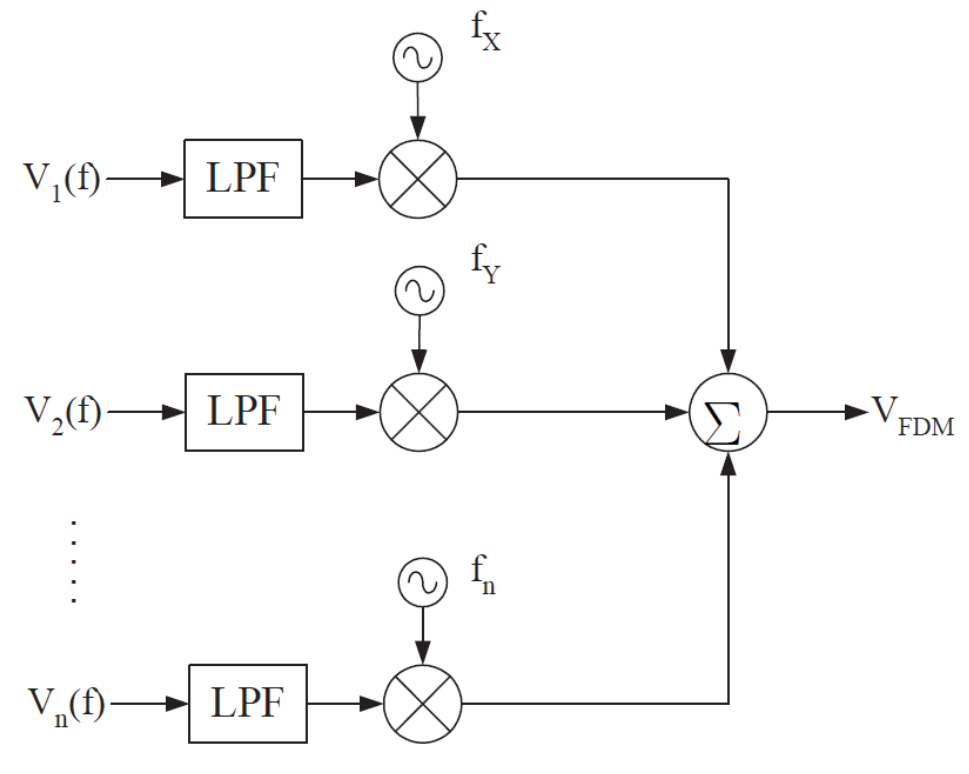 Understand block diagram Frequency Domain Multiplexing (FDM) systems