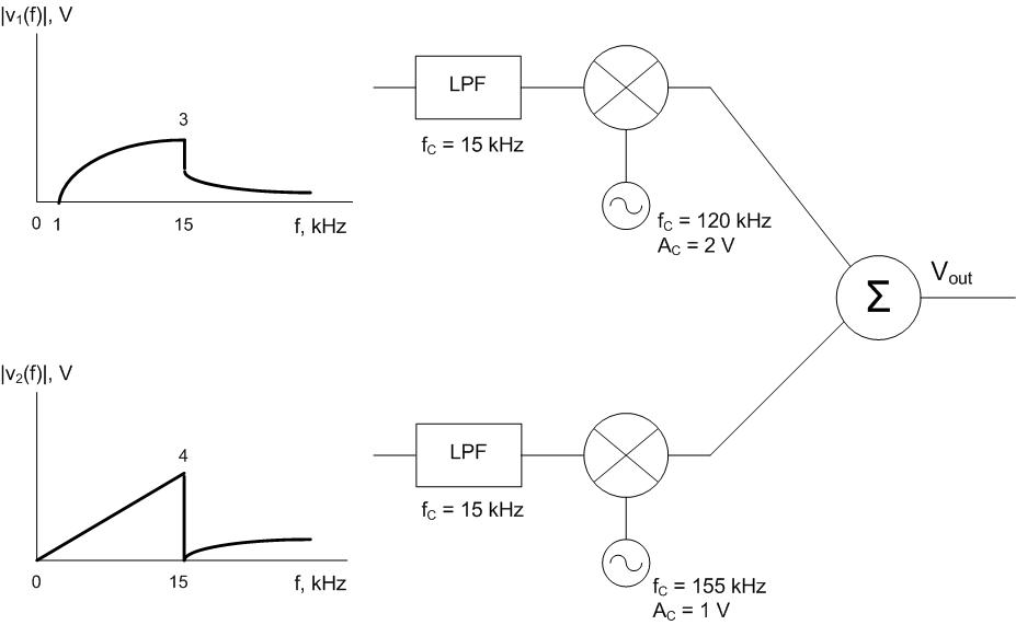 Everything else we do is the same (mathematically) as previous problems. We shift the first signal by the carrier frequency, 120 kHz (since this represents the sum of the frequencies), then draw its mirror image (since this represents the difference of the frequencies). Next, we shift the second signal by 155 kHz and draw its mirror image. If the LPFs were not in the signal chain, the output signals would interfere with each other, however, because the filters enforce a channel bandwidth of 30 kHz, though, the resulting signals no longer interfere with each other.