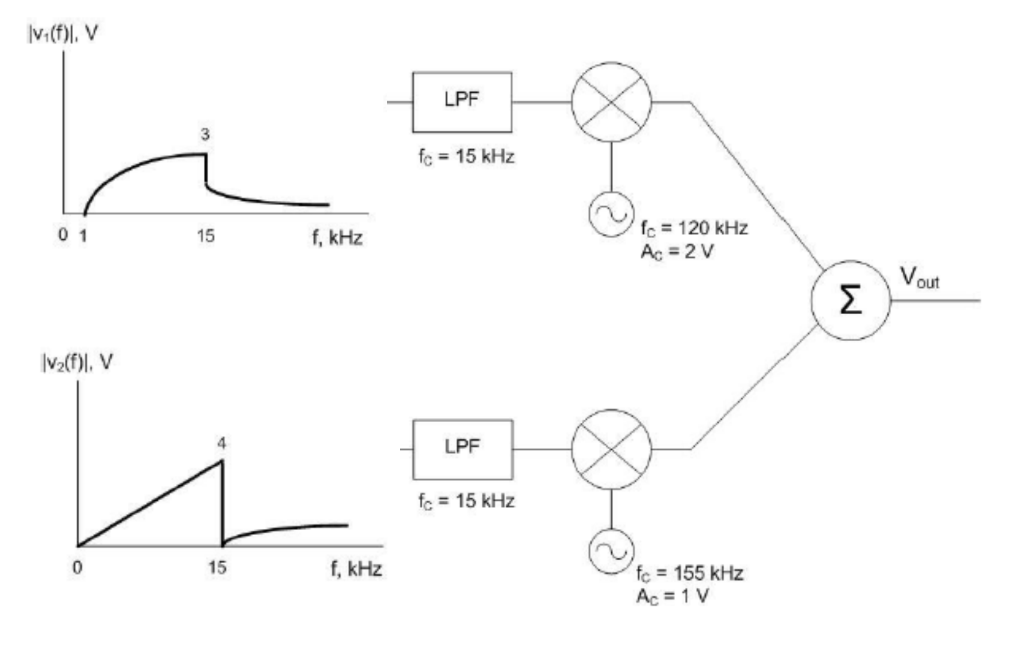 Graph the output of the multiplexer in the frequency domain. What is the bandwidth of \(v_{out}\)?