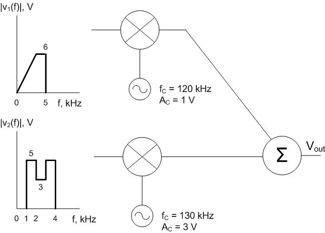 Graph the output of the multiplexer in the frequency domain. What is the bandwidth of \(v_{out}\)?