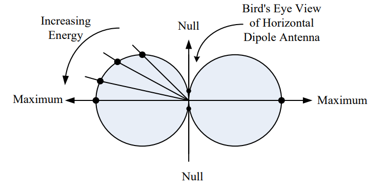 Consider what would happen if we placed the dipole vertically and walked around the dipole in a circle, keeping our distance to the antenna constant. In this case, we would find all of the received power measurements are equal. So the radiation pattern around the axis parallel to the orientation of the dipole would be a circle as shown in Figure 1. For the radiation pattern, the outward distance from the center of the dipole represents power and not distance in meters. Therefore, if the radiation pattern is closer to the antenna, less power is being radiated in that direction.