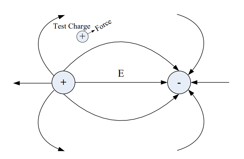 Coulomb’s Law states an electric force exists between a stationary positive charge and a stationary negative charge. Since the electric field is just the force per unit of charge, the electric field pattern in the following figure can be found by knowing the direction of force on a positive test charge placed in the vicinity of the two fixed charges. The arrows indicate the direction of force on a positive test charge, if one existed. Since positive test charges follow the direction of electric field lines and negative charges behave in the opposite manner as positive test charges, we know that negative charges must move in the direction opposite of the arrows on the electric field lines.