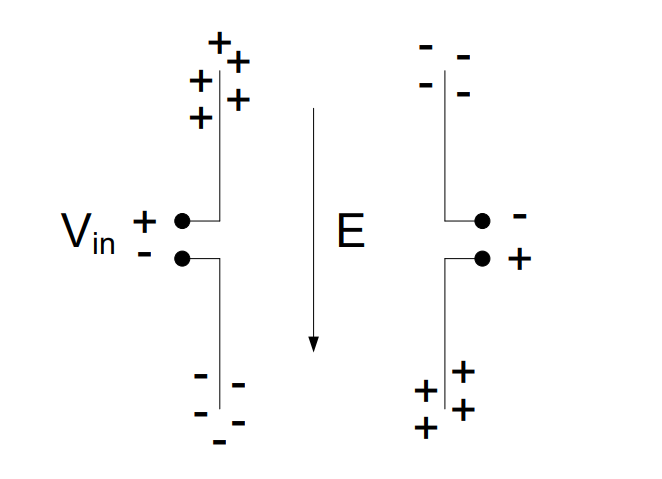 Therefore, in the bottom half of this antenna, the input, which is the negative terminal of \(V_{in}\), pushes the electrons in the lower wire away, causing an accumulation of negative charge at the bottom of the antenna. Similarly, in the top half of the antenna, there is a positive charge at the input, which draws electrons in the wire towards the input, leaving behind an area of positive charges at the tip of the antenna (we can denote positive charge as the absence of electrons). The result is an area of positive charges at one tip of the antenna and an area of negative charges at the other. The difference in charges between the two ends of the antenna creates an electric field, labeled E in the above diagram.