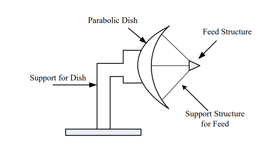Parabolic Dish: A parabolic dish antenna (shown below) focuses signals in a specific direction, which allows them to travel farther. Recall that a parabola focuses parallel rays to its focal point. The actual antenna element, called the feed, is usually a dipole or horn antenna placed at the focal point. The feed acts as either a collector (receiver) or emitter (transmitter) for the antenna. In the receiving case, the feed collects all the rays focused by the parabolic reflector dish. In this way, the antenna can capture much more of the energy than just the feed antenna by itself. However, this is limited to a very small spatial area. In the transmitter case, the feed directs the energy towards the dish, where the energy is then focused in the direction the antenna is pointing. Note spherical and parabolic antennas are very similar but differ slightly in the way they focus energy.