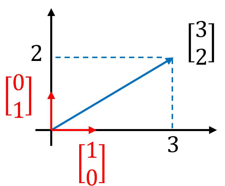 This idea is closely related to expressing a vector as a linear combination of basis vectors. For example, consider a vector \(\begin{bmatrix} 3 & 2 \end{bmatrix}^\top\) as illustrusted in Fig. 5. This vector can be decomposed as