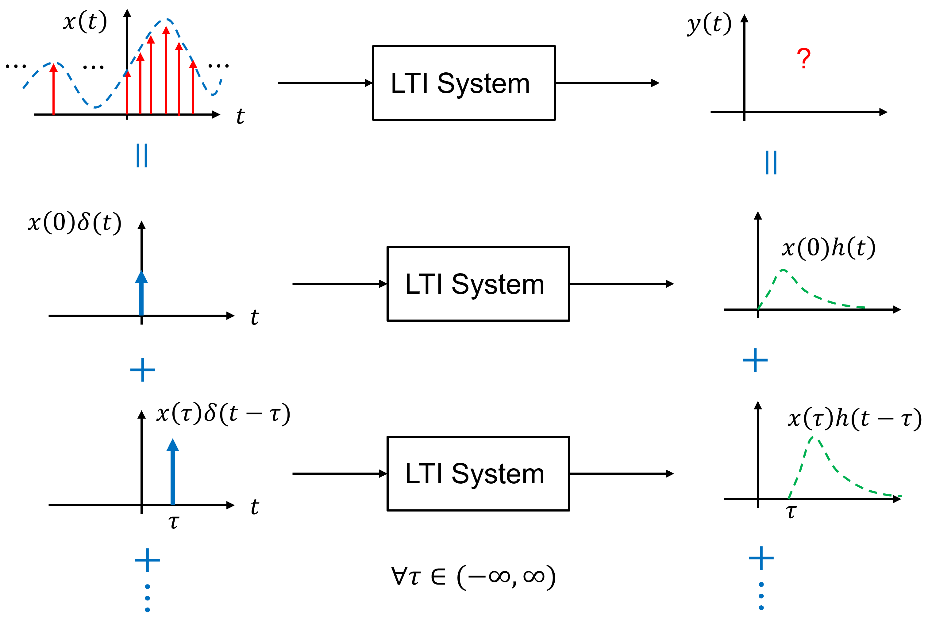 Conceptually, this representation says that continuous-time signal can be constructed by stacking together infinitely many infinitesimal impulses. Each impulse contributes independently to the system output, and the total signal is formed by integrating over all such contributions.