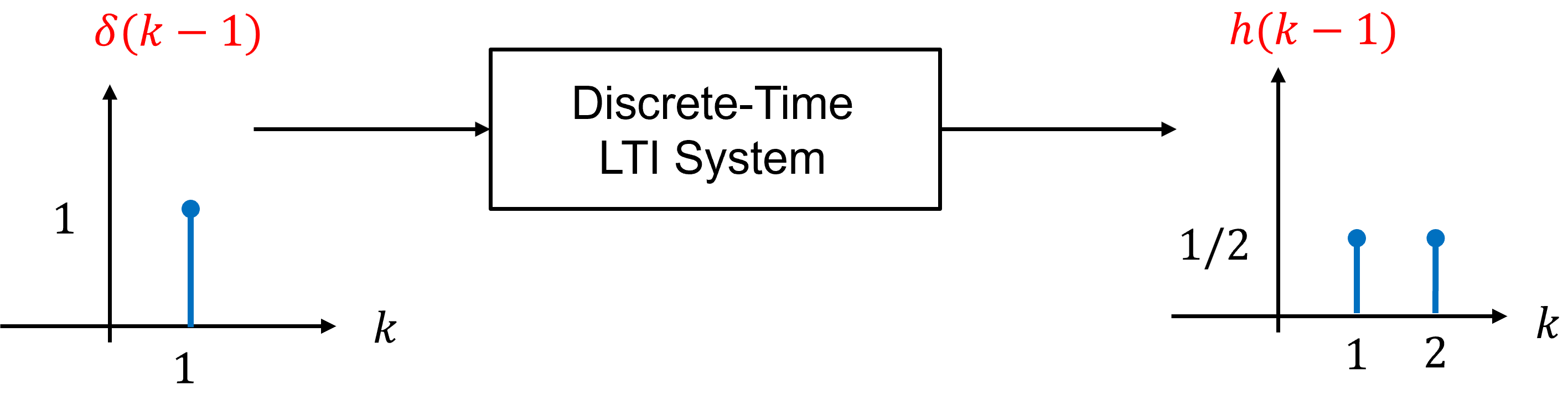 Fig. 2 demonstrates the time-invariance property visually. When the impulse input is shifted (or delayed) in time, the output shifts (or delays) by exactly the same amount.