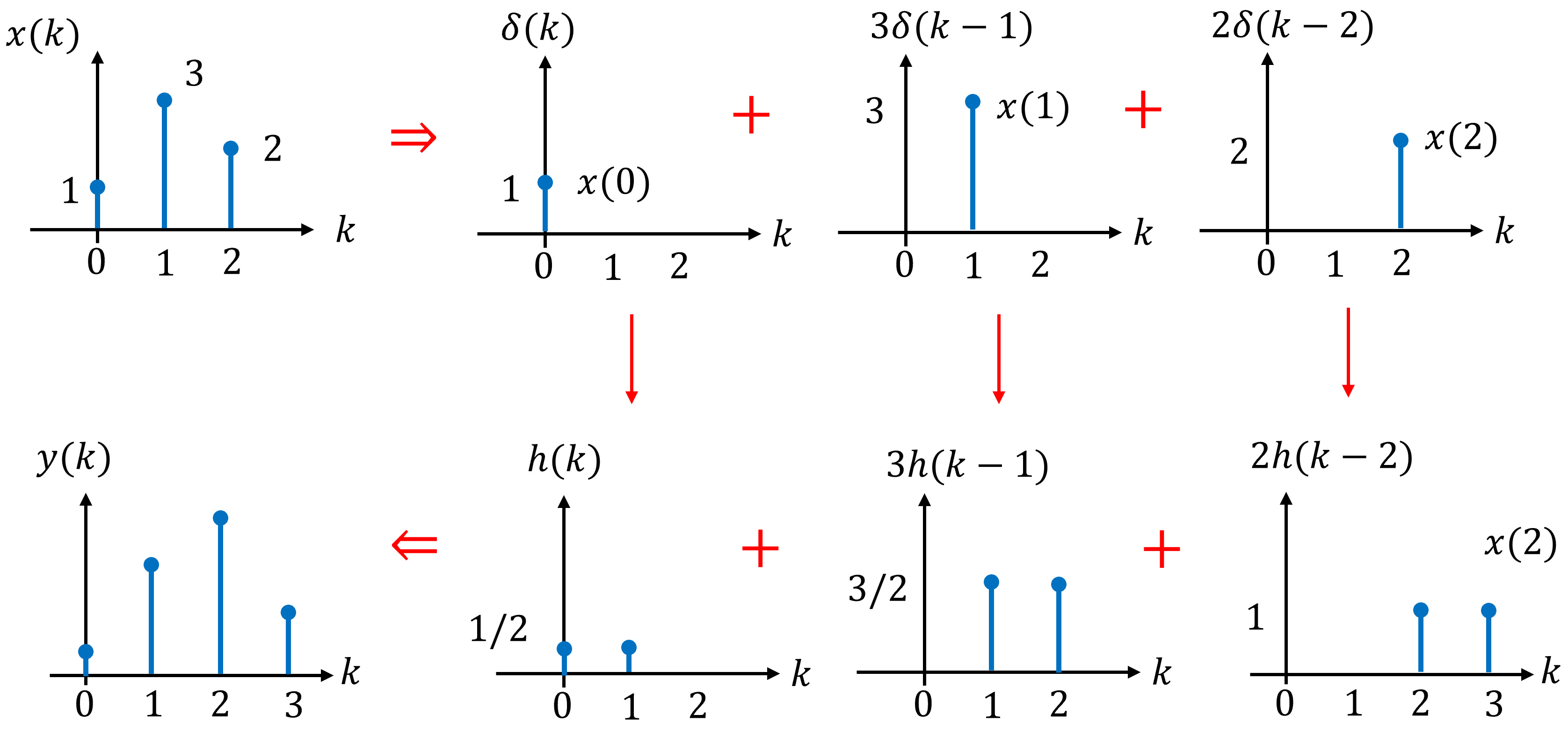 Here, the unit vectors form a basis for \(\mathbb{R}^2\). Similarly, shifted impulse signals form a basis for discrete-time signals. From this perspective, convolution emerges naturally as the process of combining the system’s responses to each basis element.