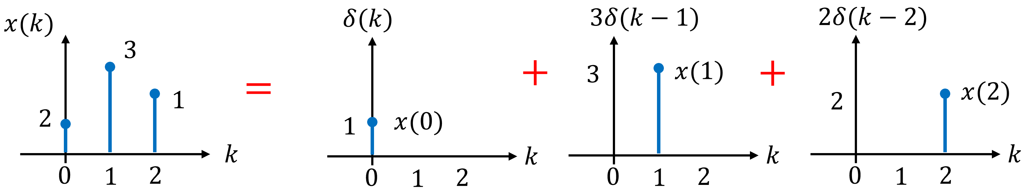 This expression states that the signal consists of three impulses: one at \(k=0\), one at \(k=1\) with weight 3, and one at \(k=2\) with weight 2. Each impulse represents the value of the signal at a specific time index. More generally, we can rewrite this expresion using the signal values \(x(n)\) as coefficients: