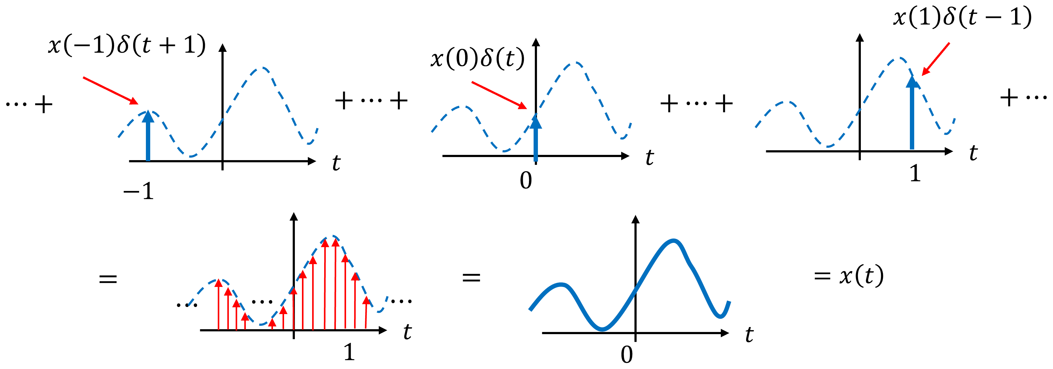 This expression is the continuous-time counterpart of impulse decompositon in discrete time. Each shifted (or delayed) impulse \(\delta(t-\tau)\) isolates the value of the signal at time \(\tau\), while the coefficient \(x(\tau)\) determines the strength of that impulse.