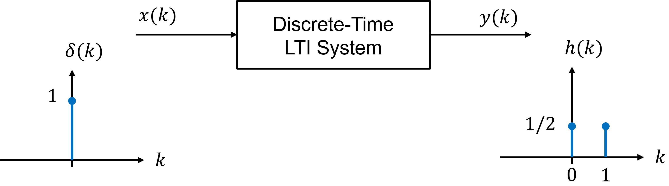 Fig. 1 Block diagram of a discrete-time LTI system showing input \(x(k)\), output \(y(k)\), impulse input \(\delta(k)\), and impulse response \(h(k)\).#
