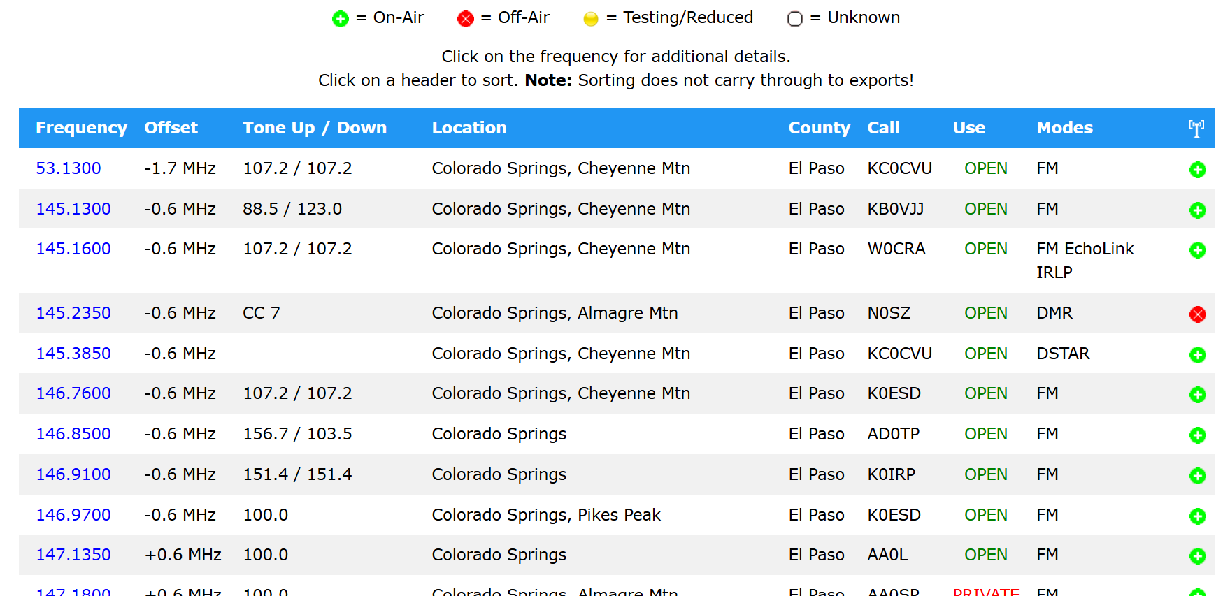 However these frequencies aren’t consistently active. Search other categories in El Paso County (e.g., schools, businesses). Specifically, look for frequencies using FM or FMN in the Mode column. Your gqrx software is able to easily decode these types of signals. Potentially more active narrowband FM frequencies are found on amateur radio frequencies (depending on the time of day). You can find what frequencies are commonly used in the Colorado Springs area at https://repeaterbook.com/.