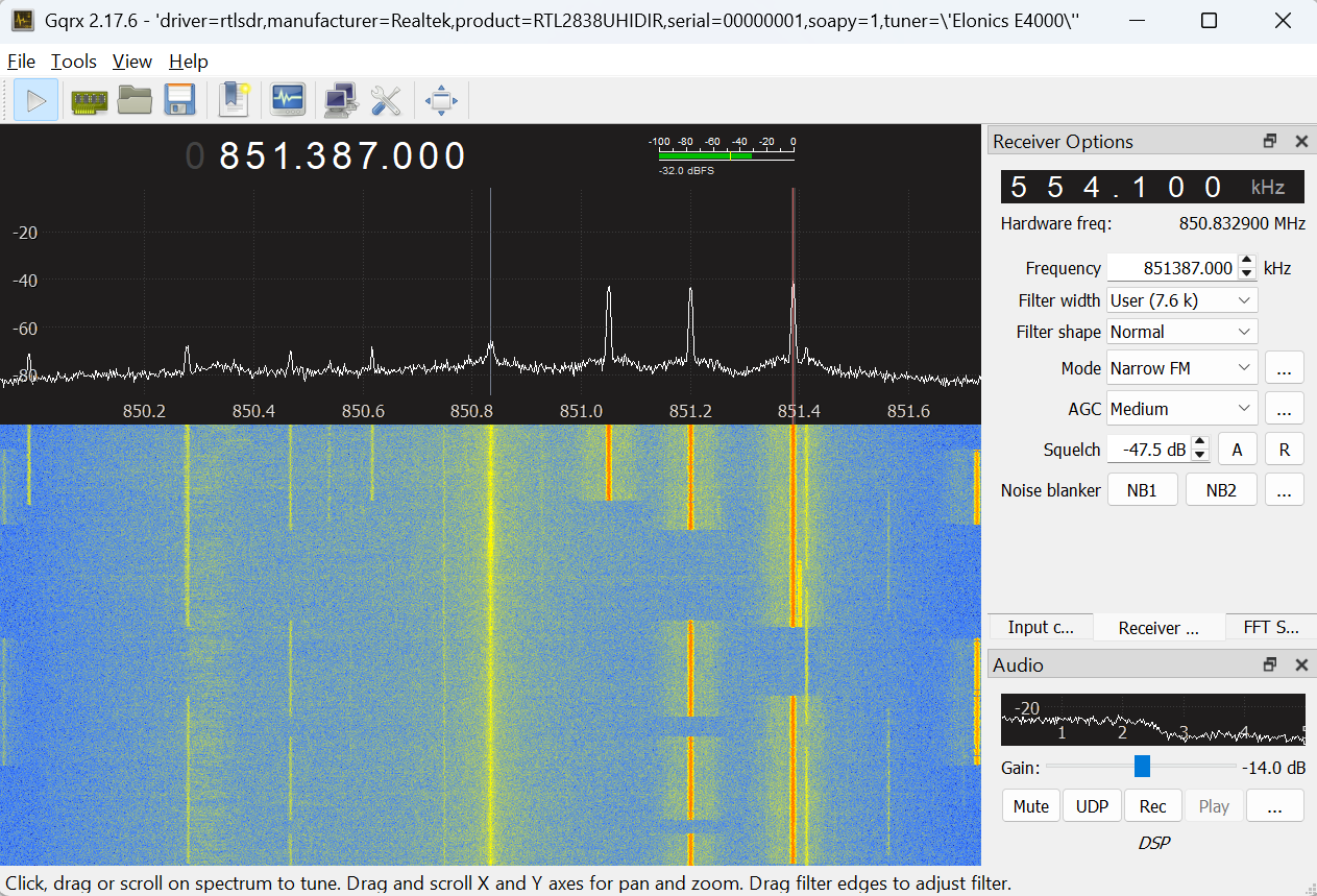 Here I set the receiver frequency is to 851.387MHz and the receiver offset to 554.1kHz, so we are receiving the frequency 850.8329MHz. This region of the spectrum is part of the Digital Trunked Radio System (DTRS) used by law enforcement, fire departments, EMS and other emergency services. It uses a digital modulation scheme that encrypts transmissions for security. You won’t hear anyone talking - just digital sounding signals. Also, the frequencies won’t be exactly correct, because the crystal in your SDR drifts with as it warms up. We’ll look at calibrating this out later in the course.
