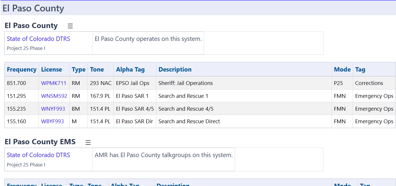 Searching the Radio Reference Databse (RRDB) for Colorado Springs brings up El Paso County. In the screenshot below, you can see the El Paso County search and rescue communications are narrowband FM (FMN) signals near 151MHz and 155MHz.