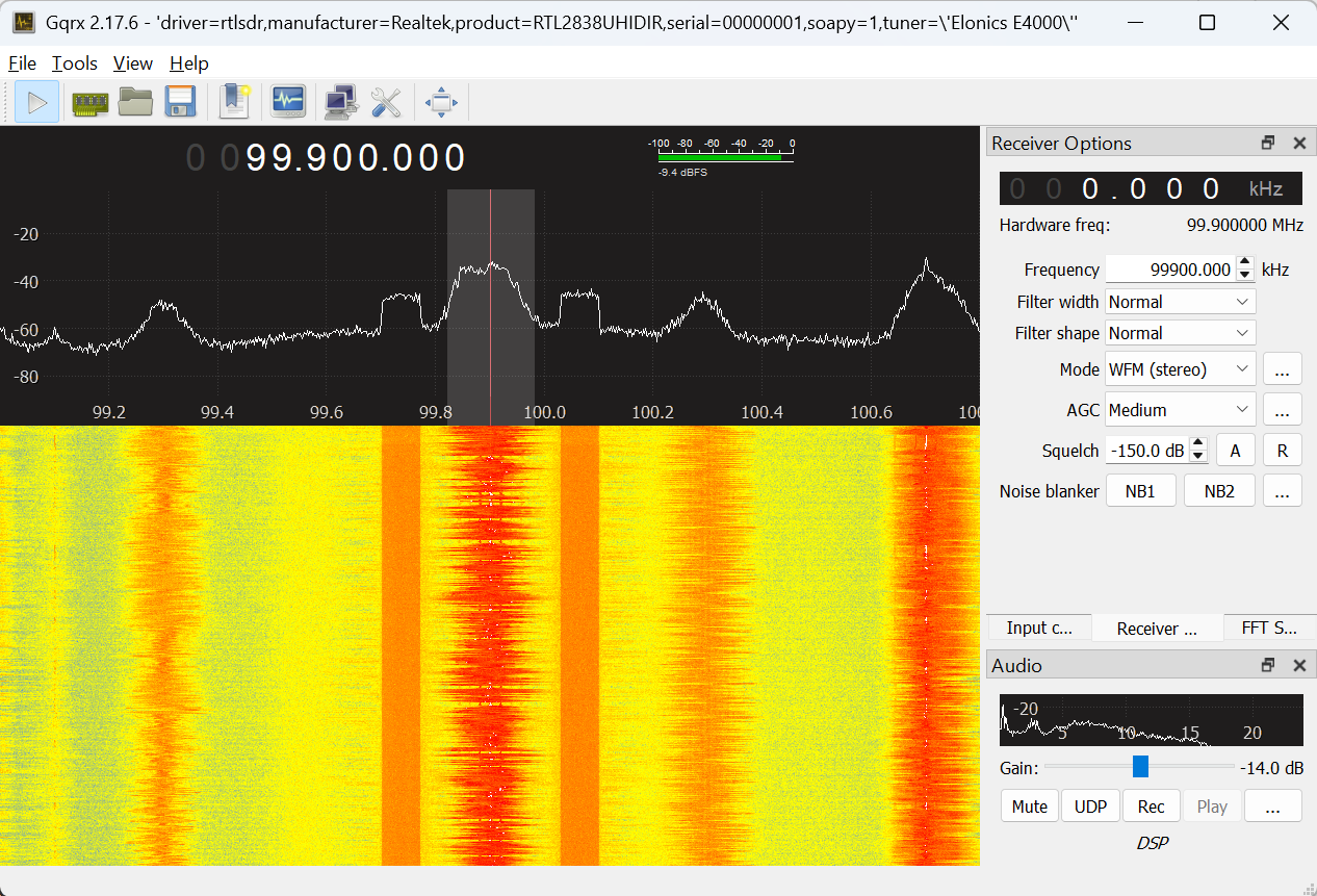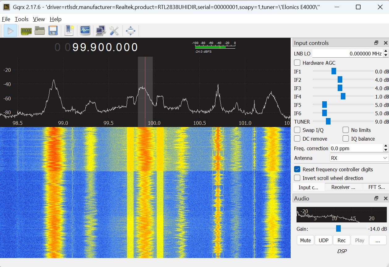 The gqrx web page is http://gqrx.dk, if you want to learn more. Next, we’ll use gqrx to pick up commercial FM radio.