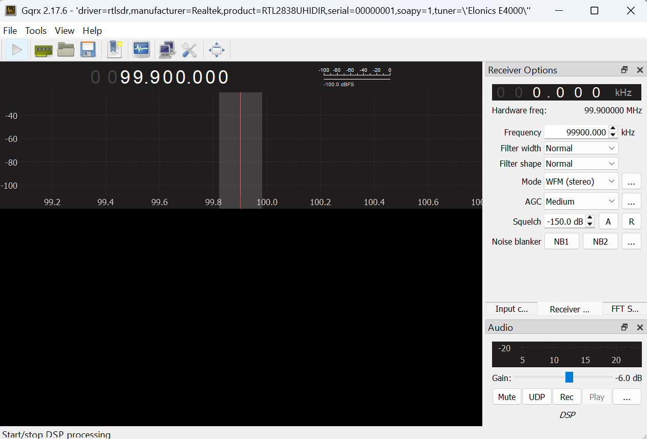 Set the frequency offset in the upper right to 0.000 kHz, and then set the receiver frequency at the top of the plot to 99.900.000 Hz (or 99.9MHz) by: