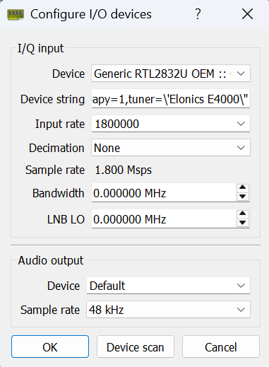 If you haven’t already done it, connect the antenna and plug the SDR into a USB socket on your computer. Then, start gqrx. When you start gqrx, it will pop up a window for the device configuration. In the Device drop down menu, select “Generic RTL…”