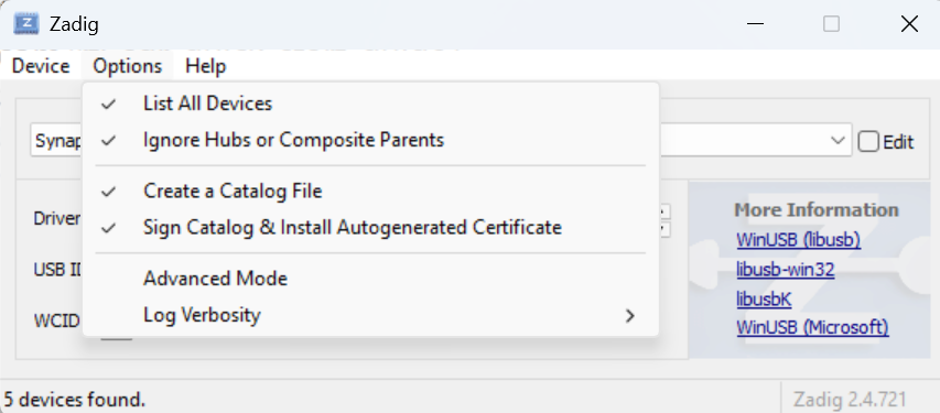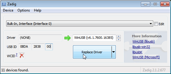 Verify the Driver shows WinUSB on the right of the green arrow. The right hand box shows the currently installed driver, and left hand box shows the driver that will be installed. It doesn’t matter what the right hand box shows, but it will likely be (NONE) or (RTL…).
