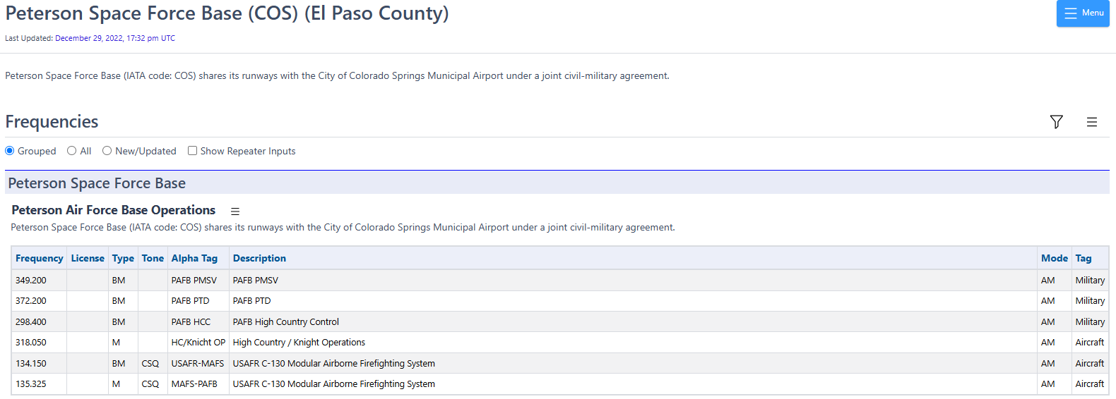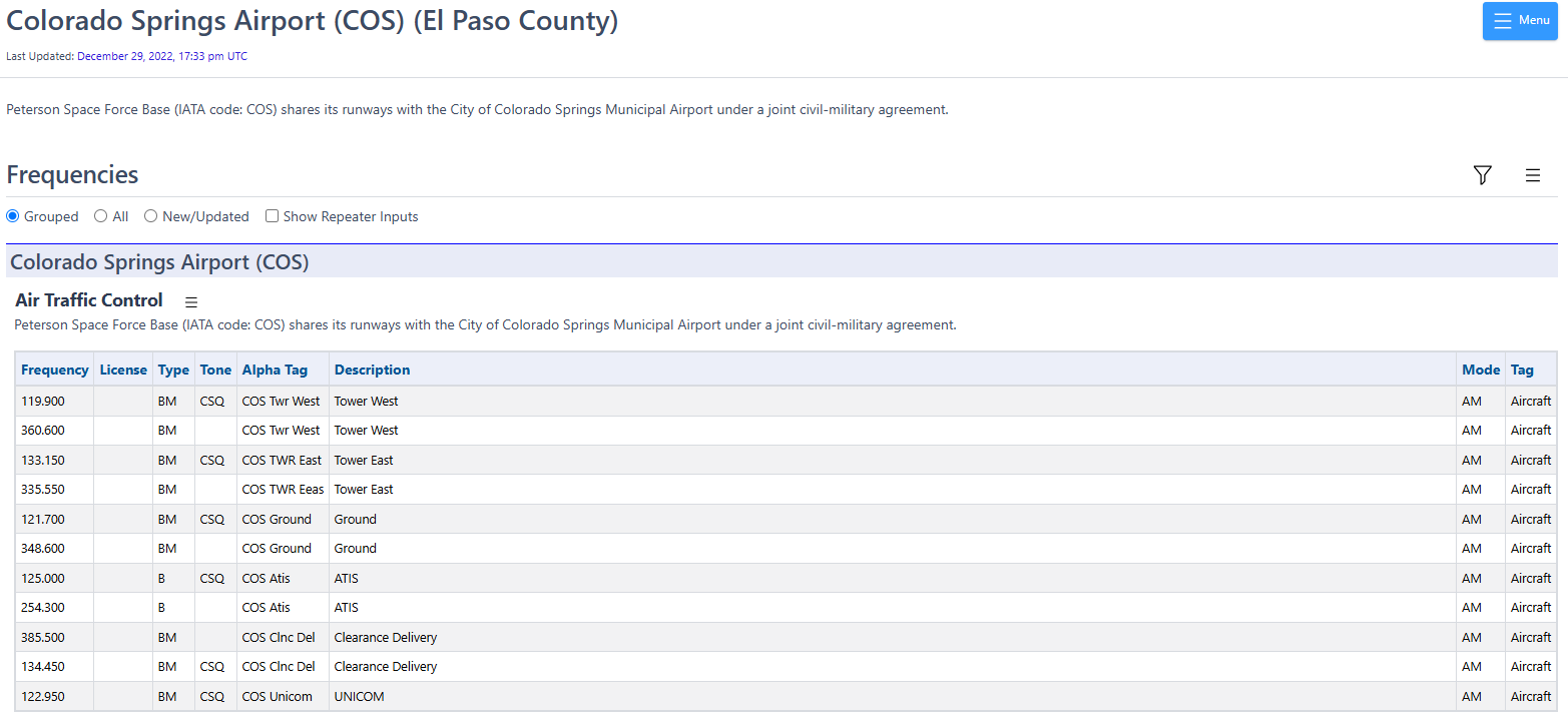 If you leave USAFA, you can also hear traffic from the Colorado Springs Airport and Peterson SFB. Since both use the same runways, they both use the same International Air Transport Association (IATA) code of COS. However, they do not use all of the same radio frequencies. For the main civilian airport, the frequencies are: