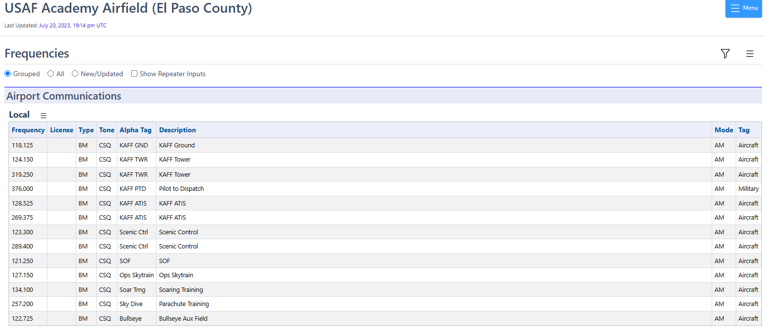 The USAFA Airfield transmits on these frequencies: